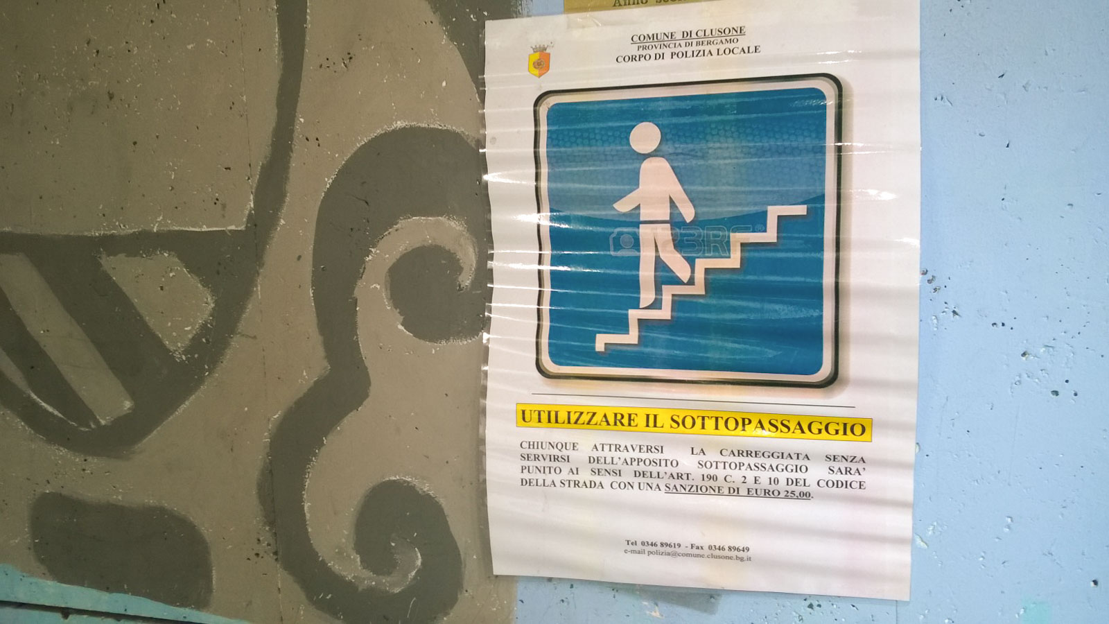 Tuttavia forse molti non sanno che da qualche mese lungo il tunnel sotterraneo che permette di superare in sicurezza la strada è stato posto un cartello che ricorda che ai sensi del Codice Stradale attraversare la strada dove c’è un sottopassaggio comporta una sanzione di 25 euro.