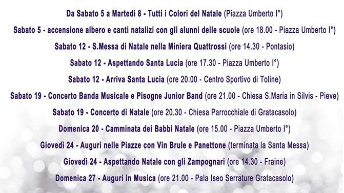 «Il 5, 6, 7 e l’8 dicembre – spiega il presidente della Pro Loco Andrea Benaglio – il centro tornerà ad animarsi con una manifestazione con la quale abbiamo voluto dare risalto ai prodotti locali. Saranno quattro giorni di spettacoli con artisti di strada, cornamuse, giocolieri e la banda musicale di Pisogne che intonerà melodie natalizie. Sarà anche una bella vetrina per le associazioni di Pisogne che presenteranno i loro prodotti e servizi. Ricordo che la società pisognese è votata all’associazionismo: sono oltre 140 le associazioni attive. Nel pomeriggio del 12 dicembre proseguiremo con la tradizionale Santa Messa nella miniera Quattro Ossi di Pontasio organizzata dal Cai di Pisogne. La sera, come da tradizione, Santa Lucia si calerà dalla Torre, se ne andrà prendendo il largo e ritornarà a Toline. Il 19 abbiamo due concerti augurali: uno alla chiesa della Pieve di Pisogne organizzato dalla Pisogne Junior Band, diretta dal maestro Marco Romele, l’altro alla parrocchiale di Gratacasolo. Il 20 dicembre, dopo il successo dell’anno scorso con circa 500 iscritti, proporremo la seconda edizione della “Camminata dei Babbi Natale”. Infine vi saranno due concerti: uno il 24 e l’altro il 27 dicembre. Il primo a Fraine con gli zampognari, il 27 a Gratacasolo sentiremo le voci bianche dirette dal maestro Giuseppe Gelmini».