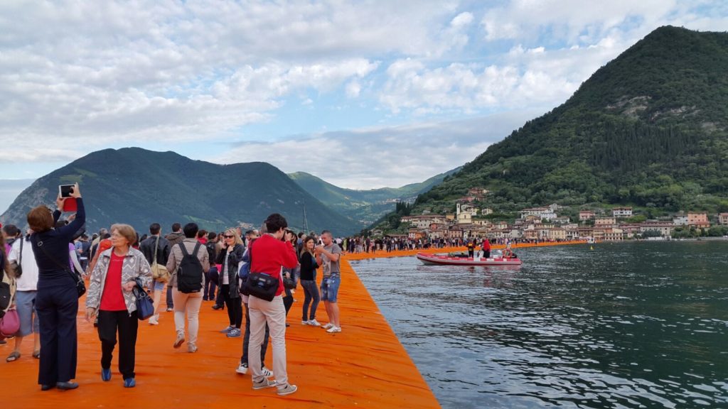 «The Floating Piers», l’installazione dell’artista statunitense di origini bulgare Christo Vladimirov Javacheff, collega Montisola alla terraferma e all’isola di San Paolo. Complessivamente è lunga quattro chilometri e mezzo, tre nel tratto più lungo. Sulla passerella possono salire, contingentate, più diecimila persone contemporaneamente ed è ricoperta di tessuto giallo dalia.