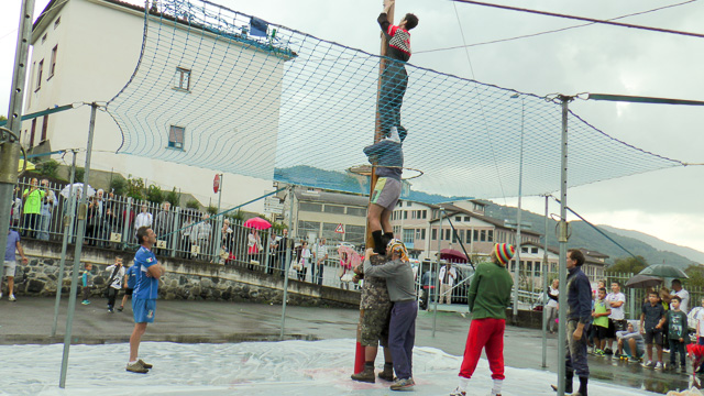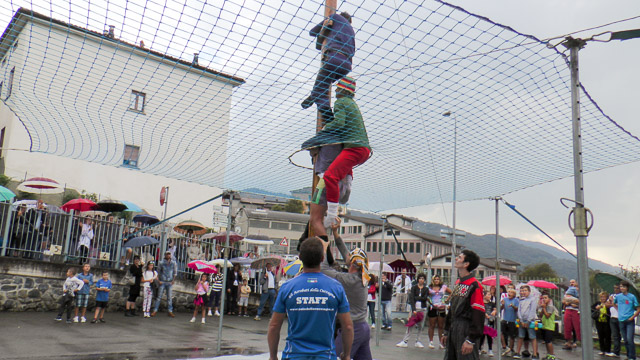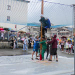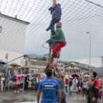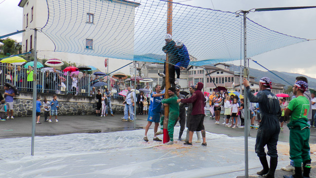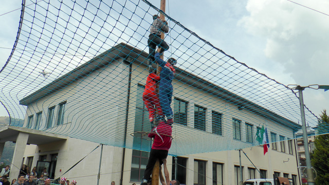 A rendere più difficile una salita già di per sé complicata è arrivata anche la pioggia. Ma organizzatori e partecipanti non si sono scoraggiati. Un po’ di attesa e, appena il cielo lo ha permesso, il Palo della cuccagna ha potuto finalmente andare in scena.