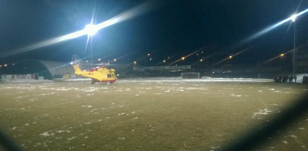 Intervento dell’elicottero del 118 a Rovetta atterrato nel campo sportivo intorno alle 19.20.