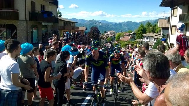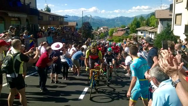 Migliaia di persone, assiepate lungo i tornanti e nel centro del paese, hanno accolto la corsa rosa, in arrivo dalla Val Brembana. Il primo a transitare sotto il traguardo del secondo Gran premio della montagna di tappa (il primo a Zogno) è stato il francese Pierre Rolland, nel gruppetto di testa di cui facevano parte anche il sudafricano Van Rensburg, l’irlandese Deignan, lo spagnolo Sanchez e l’altro francese Molard. A poca distanza il gruppo della maglia rosa Tom Dumoulin (nella foto in cima).