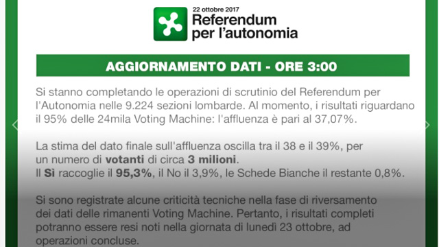 Sulla sezione dedicata del sito della Regione (www.referendum.regione.lombardia.it) non è al momento possibile accedere ai risultati del referendum (ma si viene reindirizzati), situazione che si è ripetuta anche intorno alle 19 di ieri. Una nota informativa delle 3 comunica che “si stanno completando le operazioni di scrutinio del Referendum per l’Autonomia nelle 9224 sezioni lombarde. Al momento i risultati riguardano il 95% delle 24 Voting Machine: l’affluenza è pari al 37,7%. La stima del dato finale dell’affluenza oscilla tra il 38 e il 39%. Per un numero di votanti di circa 3 milioni. Il sì raccoglie il 95,3%, il no il 3,9, le schede bianche il restante 0,8%. Si sono registrate alcune criticità tecniche nella fase di riversamento dei dati delle rimanenti Voting Machine. Pertanto i risultati completi potranno essere resi noti nella giornata di lunedì 23 ottobre ad operazioni concluse”. A questo link un articolo con i risultati parziali delle 19 di ieri.