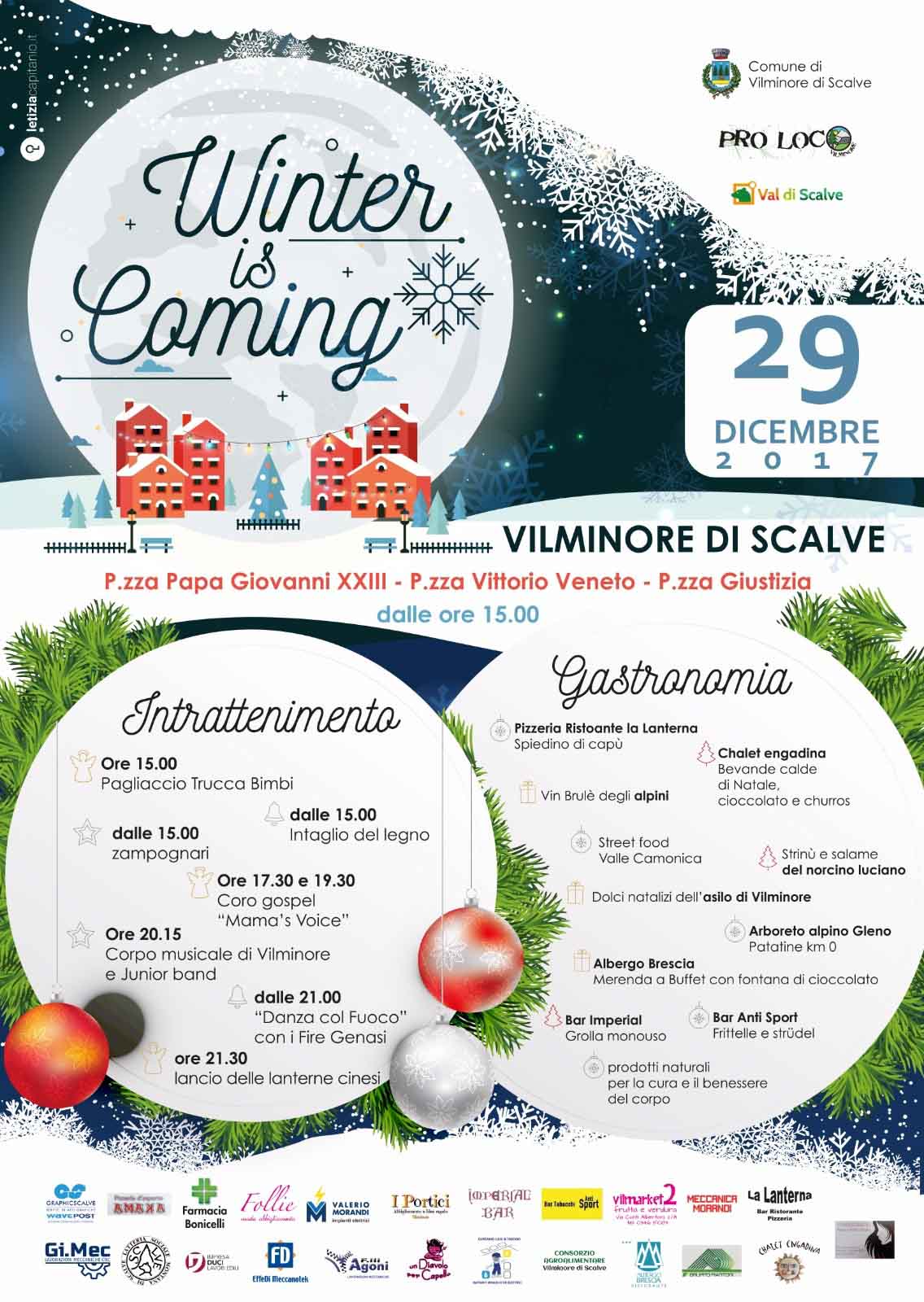 Nonostante il freddo e la neve a Vilminore non si perde l’occasione per festeggiare. Tra piazza Papa Giovanni XXIII, piazza Vittorio Veneto e Piazza Giustizia sono in corso diverse occasioni d’intrattenimento, tutte promosse già a partire dalle 15 di oggi con la notte bianca invernale “Invèren en vilminur, winter is coming”.