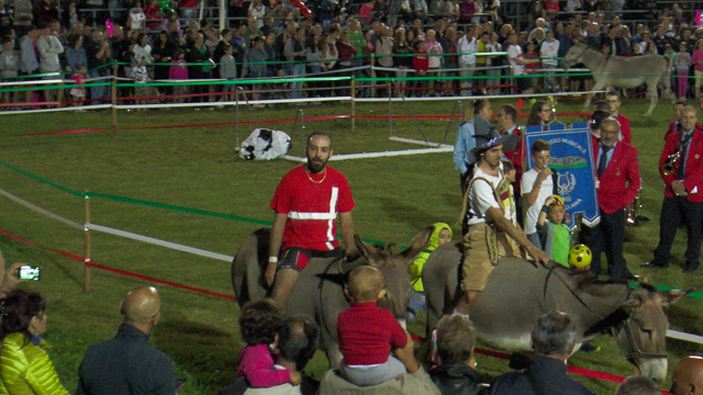 Altro che Francia. A Songavazzo il “mondiale” lo ha vinto la Danimarca. Gli organizzatori del Palio degli asini, quest’anno, si sono fatti ispirare da Russia 2018 e hanno messo in gara otto fantini con le maglie di altrettante nazionali di calcio.