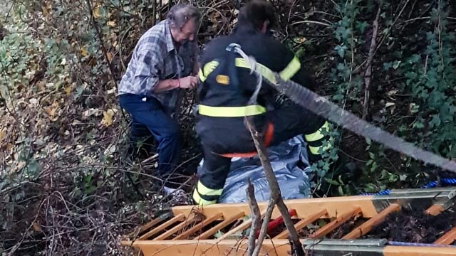 I vigili del fuoco volontari di Gazzaniga sono intervenuti oggi pomeriggio a Cirano di Gandino per recuperare un cane border collie, Buch, finito in una scarpata nella zona di via Ruviali.