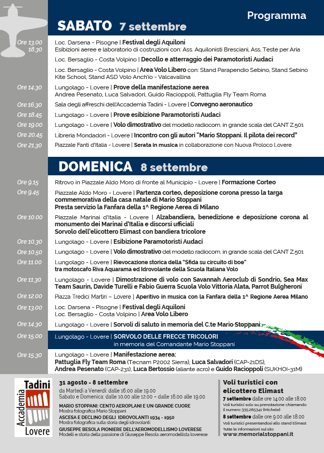 Nel pomeriggio si è dato spazio anche al programma della 17esima edizione del Memorial Mario Stoppani (7 e 8 settembre), per cui già ieri pomeriggio a Lovere sono stati effettuati sorvoli per quello che sarà il passaggio della Pattuglia Acrobatica Nazionale in programma domenica pomeriggio. Qui sotto una foto di gruppo e il nostro servizio sul sopralluogo aereo di ieri.