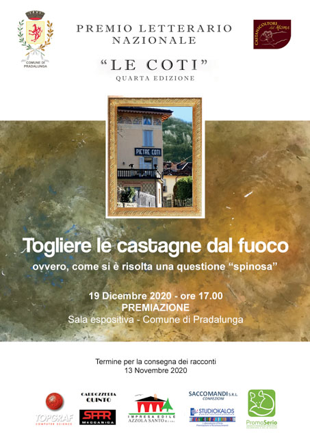 L’Assessorato alla Cultura del Comune di Pradalunga ha così promosso e organizzato, in collaborazione con l’Associazione Castanicoltori del Misma, l’edizione 2020 del Premio Letterario Nazionale “LE COTI”, sempre con l’obiettivo di far conoscere e valorizzare il territorio comunale e le sue peculiarità ma, in questa edizione, anche con la volontà di ripartire e di non perdere il contatto con i propri sostenitori e gli appassionati della scrittura.