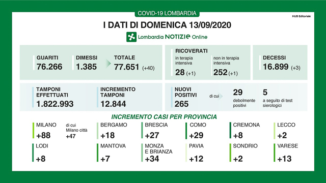 Coronavirus in Lombardia, i dati di domenica 13 settembre