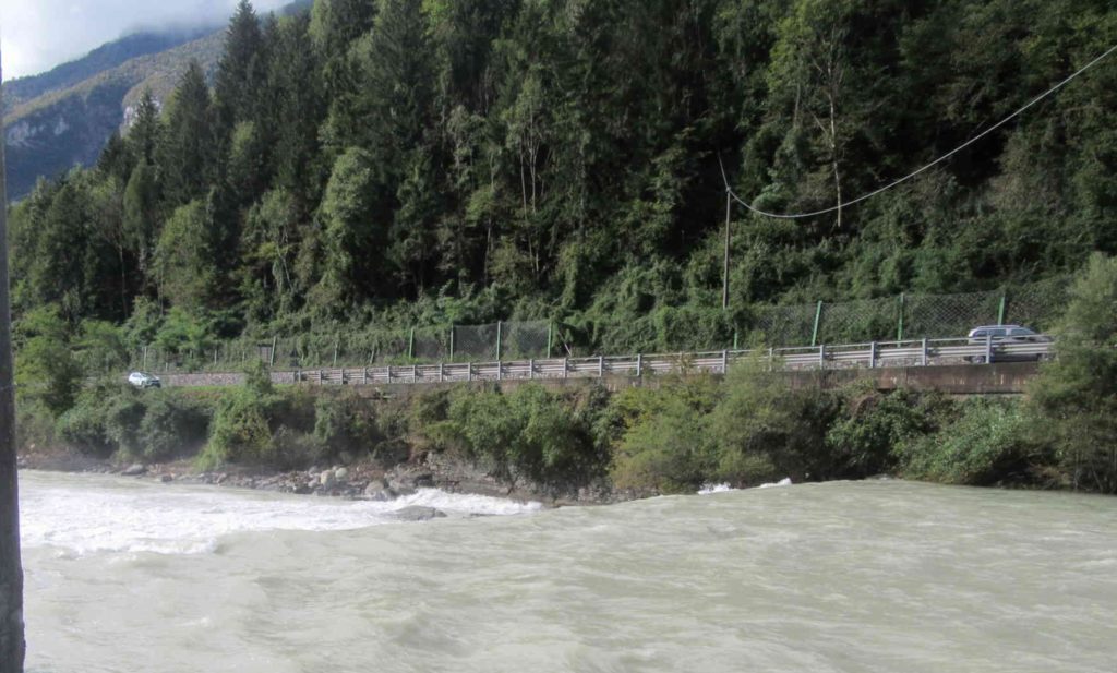 La piena del fiume Serio all’altezza del ponte di Ludrigno ha eroso il muro di sostegno della SP. 49, in caso di nuove piene del fiume potrebbe far crollare la strada con interruzione di tutta la viabilità verso l’alta Valle Seriana.