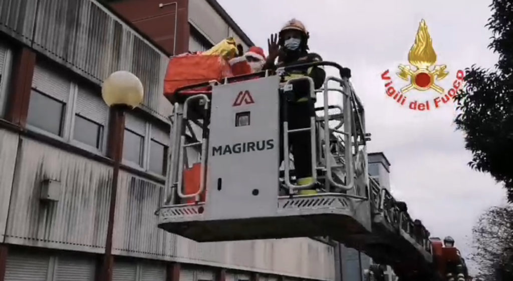 Babbo Natale Pompiere ha fatto il giro con la l’autoscala aerea salutando tutti dall’esterno.