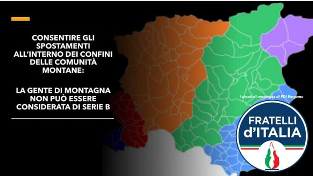 Le Valli bergamasche hanno già sia dei confini naturali, che dei confini amministrativi (le Comunità Montane): i circoli di montagna di Fratelli d’Italia Bergamo chiedono che il Governo permetta ai cittadini valligiani di circolare senza autocertificazione all’interno dei confini delle Comunità Montane.