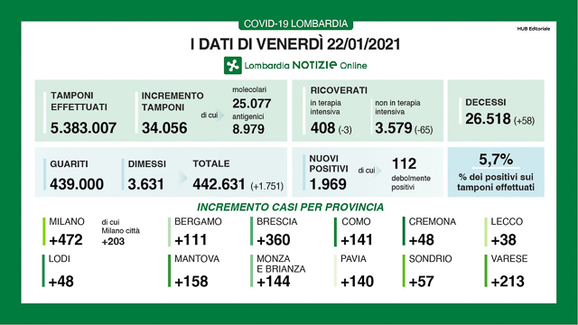 A fronte di 34.056 tamponi effettuati, sono 1.969 i nuovi positivi registrati nelle ultime 24 ore. Una percentuale del 5,7% (ieri era del 5,9%). I nuovi positivi in provincia di Bergamo sono 111; in provincia di Brescia 360. I ricoverati in terapia intensiva scendono a 408 pazienti (3 in meno di ieri), quelli nei reparti sono 3.579 (65 in meno). Guariti e dimessi aumentano di 1.751. I decessi sono 58 (ieri 55).