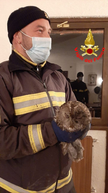 I pompieri hanno soccorso un gufo rimasto incastrato in una canna fumaria di un condominio. Il gufo è stato soccorso e liberato.