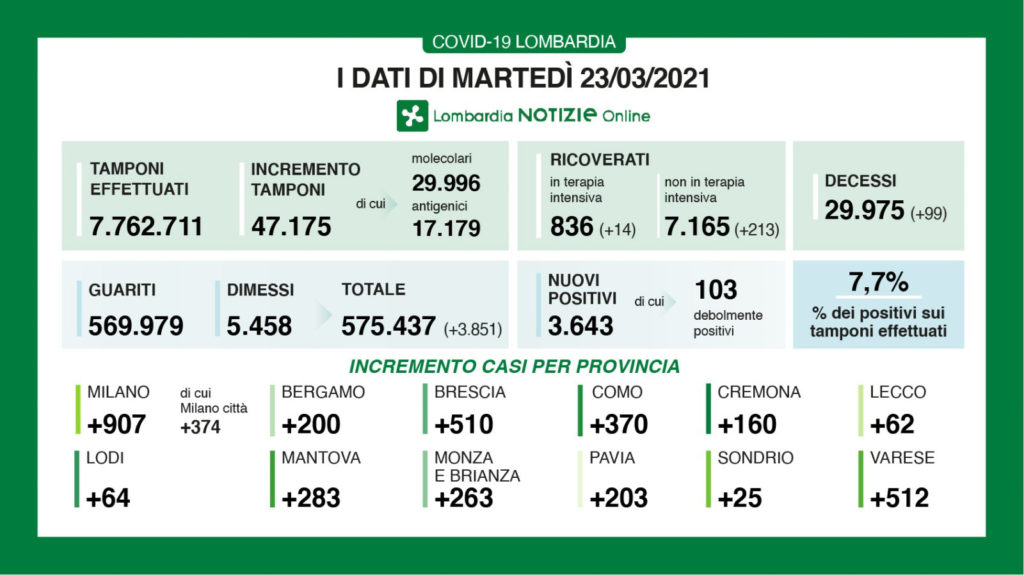 A fronte di 47.175 tamponi effettuati, sono 3.643 i nuovi positivi (7,7%). I guariti/dimessi sono 3.851.