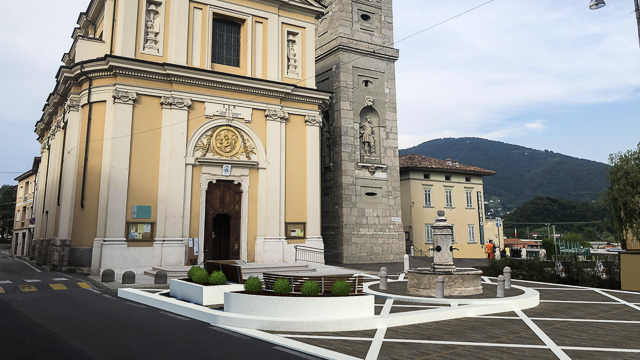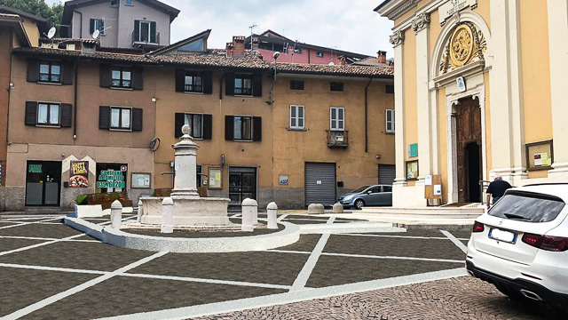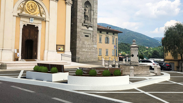 Il progetto non prevede solo un rifacimento della pavimentazione in porfido. «L’obiettivo è anche mettere in sicurezza il sagrato della chiesa e la fontana al centro della piazza, da anni oggetto di danneggiamenti da parte delle auto in manovra – prosegue Terzi -. Realizzeremo una piattaforma pedonale tra la fontana e il sagrato. Questa parte avrà una geometria a losanghe, con elementi in pietra bianca e la pavimentazione in porfido».