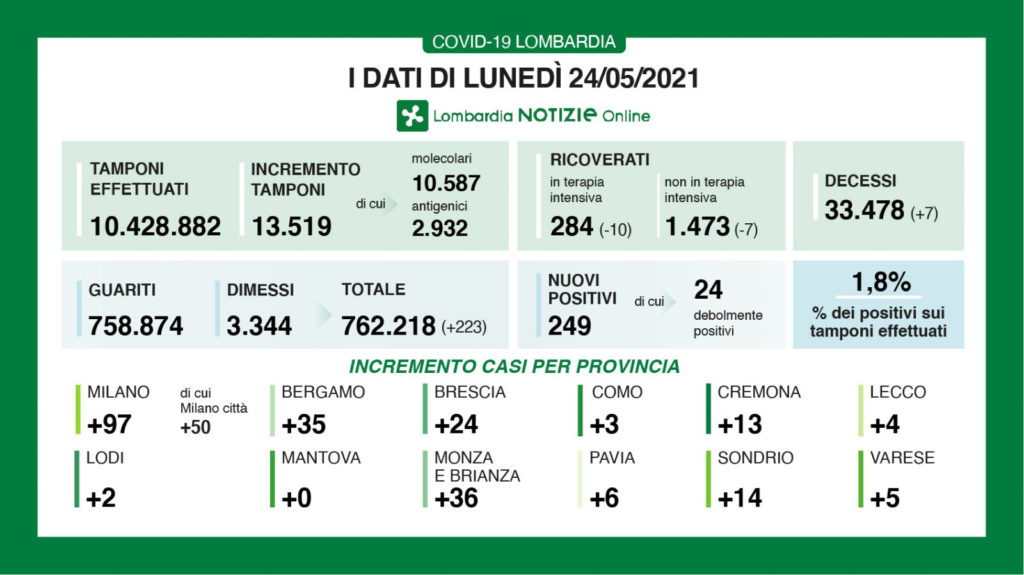 – i guariti/dimessi totale complessivo: 762.218 (+223), di cui 3.344 dimessi e 758.874 guariti