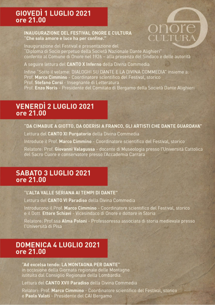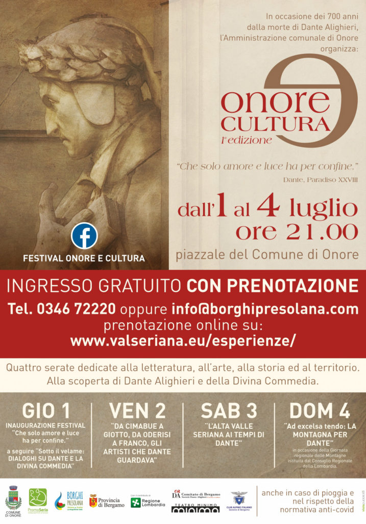 A settecento anni dalla morte di Dante Alighieri, poeta illustre del XII e XIII secolo nonché padre della lingua italiana, l’Amministrazione Comunale di Onore, in collaborazione con Promoserio – agenzia di sviluppo territoriale della ValSeriana e Val di Scalve, con il patrocinio di Regione Lombardia, della Provincia di Bergamo, del Club Alpino Italiano di Bergamo e del Comitato di Bergamo della Società Nazionale Dante Alighieri e con il coordinamento scientifico del Prof. Marco Cimmino ha organizzato un festival culturale dedicato al Sommo Poeta.