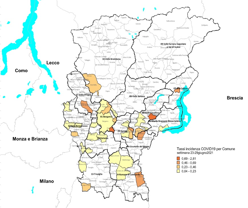 In Bergamasca la terza ondata della pandemia volge ormai al termine. Anche i dati relativi ai nuovi positivi nella settimana dal 23 al 29 giugno evidenziano un ulteriore decremento della curva. Da segnalare che l’intera Val Seriana e la Val di Scalve non hanno registrato nuovi casi e, al momento, sono “Covid free”.