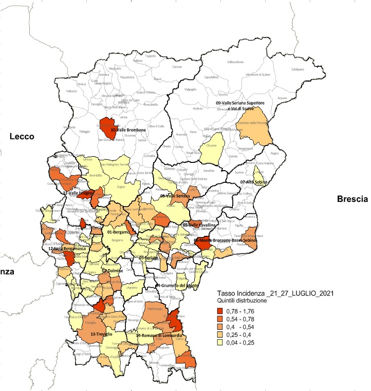 «La dimensione statistica dei nuovi casi su base comunale ed il relativo tasso di incidenza per 1.000 abitanti per la settimana 21-27 luglio 2021 conferma il trend in crescita della curva epidemica – si legge nell’analisi a cura di Alberto Zucchi, Elvira Beato e Roberta Ciampichini del Servizio epidemiologico dell’Ats di Bergamo -. L’aumento dei nuovi casi è pari a 88 (48 la settimana precedente, 9 due settimane fa, -2 tre settimane fa, -43 un mese fa), con incremento percentuale pari al 78%, simile a quello registrato la scorsa settimana (75%), contro il 16% di due settimane fa settimana (-4% tre settimane fa; -43% un mese fa). La media giornaliera dei casi incidenti sale a 29, contro i 16 della scorsa settimana, i 9 due settimane fa e gli 8 di tre settimane or sono, riportandoci ai valori della seconda settimana di giugno (25 nuovi casi negli ultimi 7 giorni nella settimana 8-15 giugno 2021)».