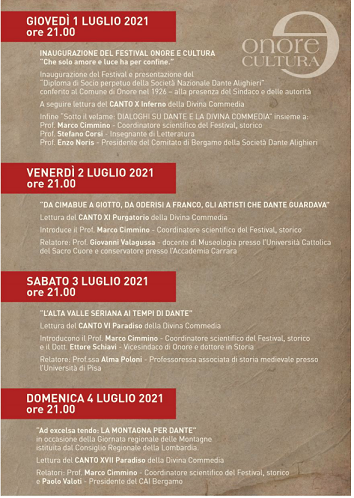 Onore, prosegue il Festival Onore e Cultura, ieri (venerdì 2 luglio) un incontro sugli artisti a cui guardava Dante, questa sera (sabato 3 luglio) una fotografia sull’Alta Valle Seriana ai tempi di Dante. Domenica si continua con “La montagna per Dante”.