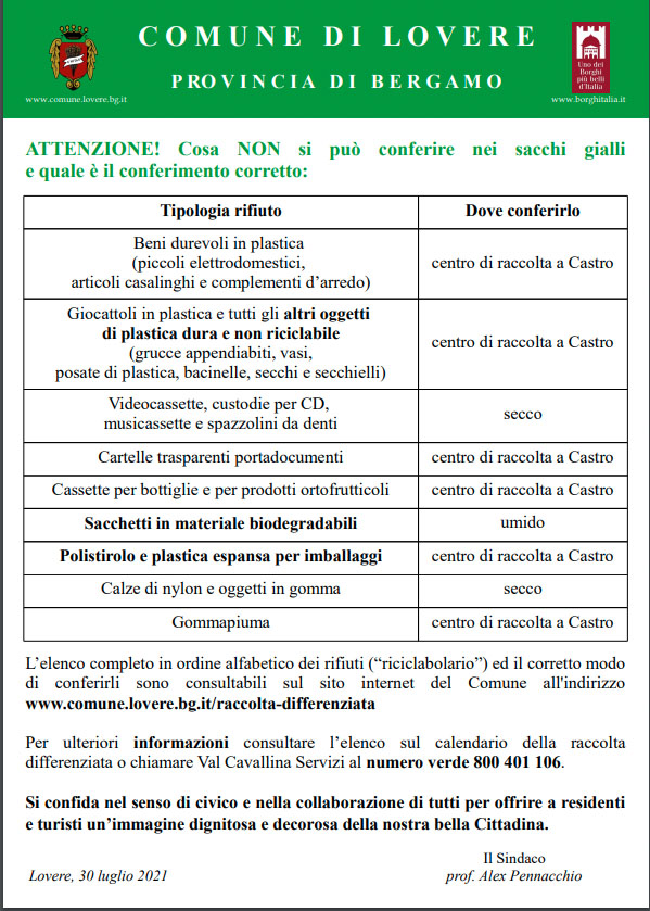 A Lovere l’amministrazione comunale sta avviando una campagna di sensibilizzazione sul corretto conferimento della plastica usata, ribadendo cosa può essere messo e cosa no nei sacchi gialli.
