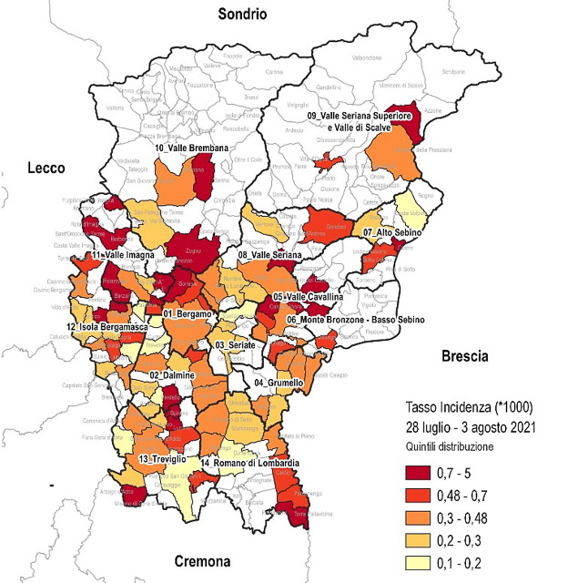 «La dimensione statistica dei nuovi casi su base comunale ed il relativo tasso di incidenza per 1.000 abitanti conferma anche per la settimana 28 luglio – 3 agosto 2021 il trend in crescita della curva epidemica – si legge nell’analisi a cura di Alberto Zucchi, Elvira Beato e Roberta Ciampichini del Servizio epidemiologico dell’Ats -. L’aumento dei nuovi casi è pari a 93 (88 la settimana precedente, 48 due settimane fa, 9 tre settimane fa, – 2 un mese fa), con incremento percentuale pari al 47%, inferiore rispetto a al 78% registrato la scorsa settimana e al il 75% di due settimane fa (16% tre settimane fa; – 4% un mese fa). La media giornaliera dei casi incidenti sale a 42, contro i 29 della scorsa settimana, i 16 due settimane fa, i 9 di tre settimane or sono e gli 8 di un mese fa, riportandoci ai valori della prima settimana di giugno».