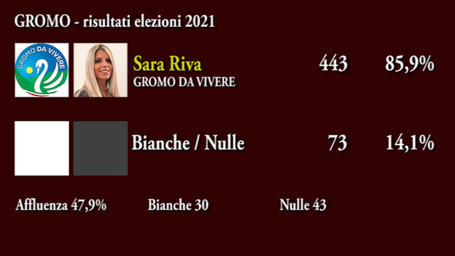 Supera con un buon margine la soglia del quorum del 40% fissato per i comuni sotto i 15.000 abitanti anche la lista di Sara Riva, che agguanta il 47,91%. Cinque anni fa la lista della sindaca aveva incassato il 56,53%.