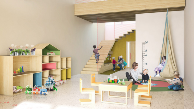 Il nuovo edificio della scuola dell’infanzia sarà articolato su due piani. Il pianoterra, per una superficie complessiva di 1183 metri quadrati, sarà interamente occupato dagli spazi dedicati alle attività educative e ricreative dei bambini, oltre a locali di servizio. Nello specifico, ci saranno 6 sezioni didattiche (comprensive di soppalco) e relativi spogliatoi e