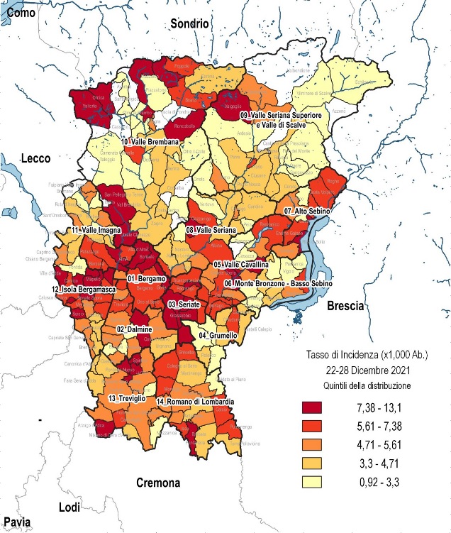 I territori con tassi di incidenza più alti, superiori alla media provinciale, risultano essere l’Ambito di Seriate (800 casi incidenti negli ultimi 7 giorni ogni 100.000 ab.), quello di Bergamo (739), Isola Bergamasca (648), Alto Sebino (633), Valle Cavallina e Valle Imagna e Villa d’Almè (entrambi con 603 casi incidenti per 100.000 ab). Gli Ambiti con i tassi minori, inferiori alla media provinciale, sono Monte Bronzone – Basso Sebino (352 nuovi casi per 100.000 ab), Valle Seriana Superiore e Valle di Scalve (363), Grumello (409), Valle Brembana (454), Valle Seriana (493).