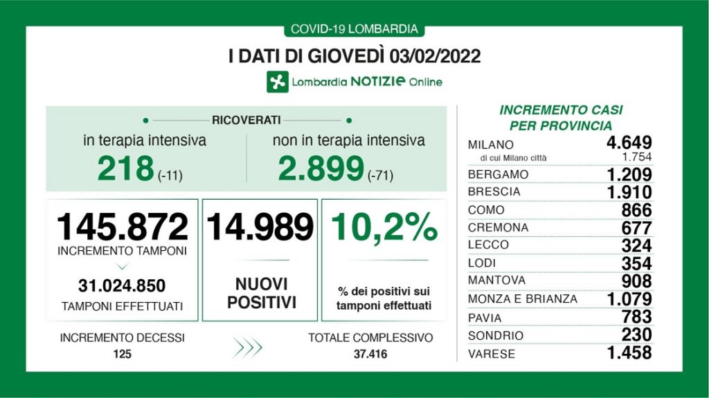 Continuano a diminuire i ricoverati nelle terapie intensive (-11) e nei reparti (-71). A fronte di 145.872 tamponi effettuati, sono 14.989 i nuovi positivi (10,2%).