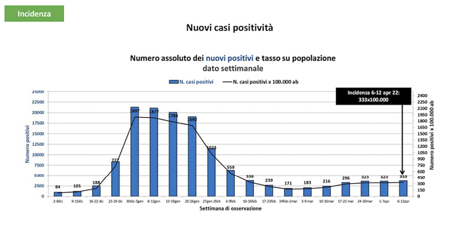 Il tasso di incidenza dal 6 al 12 aprile 2022 è pari a 333 nuovi casi per 100.000 abitanti (ovvero 3,33 per 1.000, nella metrica utilizzata a livello di singoli comuni), contro i 321 della scorsa settimana, i 319 di due settimane fa, i 288 di tre settimane or sono e i 208 di un mese fa.