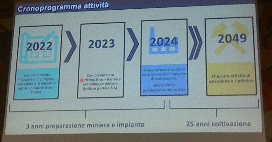 «La miniera con le attività di coltivazione sarà nella zona di Oltre il Colle, dove c’è il giacimento – ha spiegato il managing director -. La lavorazione sarà presso l’area industriale di Zorzone. Non verranno realizzate discariche per le code di lavorazione in esterna, come invece succedeva in passato. Non si prevedono nemmeno discariche di sterile. Si programma di sfruttare i vuoti della stessa miniera nel rispetto delle normative ambientali e di immettere sul mercato anche lo sterile».