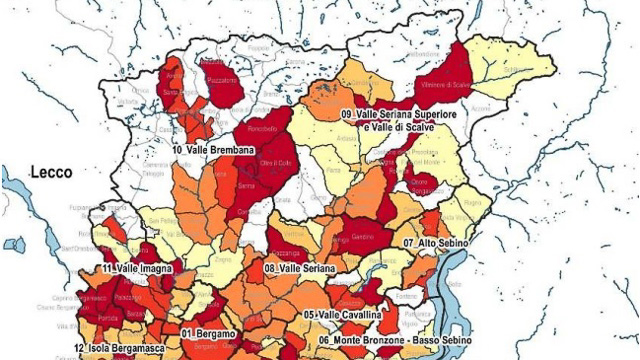 I territori con tassi di incidenza superiori alla media provinciale (172 nuovi casi per 100.000 abitanti) sono 2: Bergamo (213 nuovi casi incidenti negli ultimi 7 giorni ogni 100.000 ab., pari a -36,3% rispetto alla settimana precedente), Dalmine (192, -37,9%). Gli Ambiti Territoriali con tassi in linea con la media provinciale sono 4: Isola Bergamasca (174 nuovi casi incidenti negli ultimi 7 giorni ogni 100.000 ab., pari a – 40,3% rispetto alla settimana precedente), Valle Seriana (171, -31,8%), Valle Cavallina (171, -42,0%), Treviglio (170, -46,5%). I territori con valori di incidenza inferiori alla media provinciale sono 8: Monte Bronzone – Basso Sebino (105 nuovi casi incidenti negli ultimi 7 giorni ogni 100.000 ab., pari a -60,5% rispetto alla settimana precedente), Alto Sebino (115, -52,7%), Grumello del Monte (139, -42,3%), Romano di Lombardia (144, -26,6%), Valle Brembana (155, -33,7%), Valle Imagna e Villa d’Almè (162, -42,4%), Valle Seriana Superiore e Valle di Scalve (164, -29,6%), Seriate (167 nuovi casi incidenti negli ultimi 7 giorni ogni 100.000 ab., pari a -43,6% rispetto alla settimana precedente).