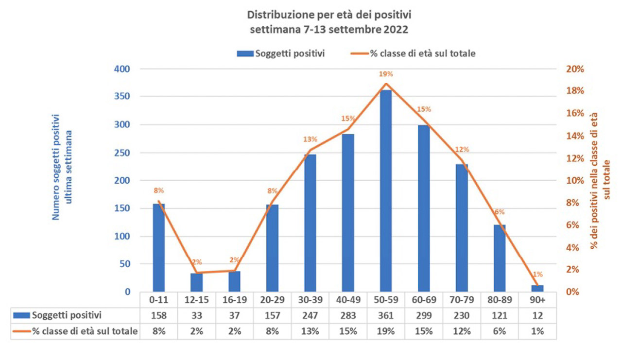 In lieve rialzo il tasso di incidenza che, nella settimana 7-13 settembre 2022, è pari a 172 nuovi casi per 100.000 abitanti (ovvero 1,72 per 1.000, nella metrica utilizzata a livello di singoli comuni). Lo scostamento rispetto alla precedente settimana è pari a +104, ovvero +6% (la scorsa settimana presentava -233 nuovi casi, pari a -11% rispetto alla settimana precedente). Negli ultimi 7 giorni la media giornaliera dei casi incidenti è in lieve aumento ed è pari a 277 contro i 262 della scorsa settimana.