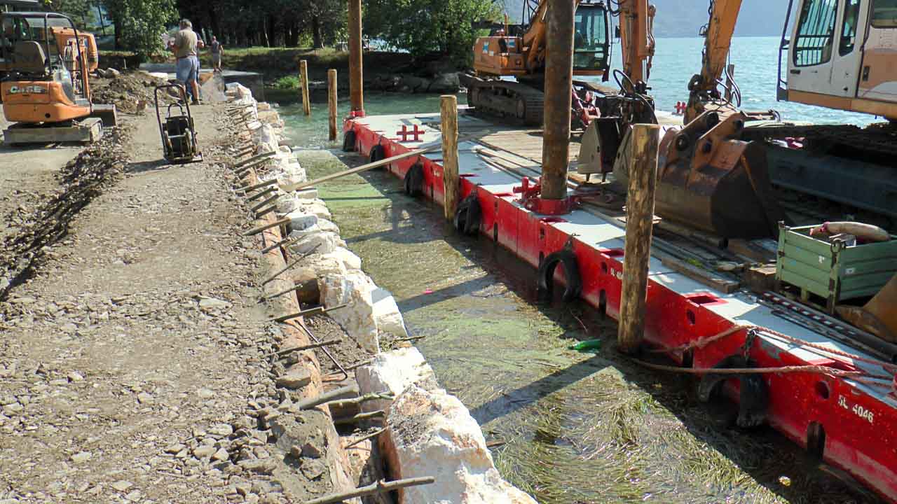 Il cantiere, su cui opera la società Ziliani F.lli & Figli s.p.a. di Iseo, occupa una lunghezza di 65 metri, in un luogo che presentava forti criticità, legate all’accesso ed alla fruizione. Il muro in calcestruzzo presente prima dell’intervento era ceduto – spiega Angelo Ziliani, titolare della ditta incaricata – e stiamo provvedendo alla messa in sicurezza ed alla riqualificazione del luogo. Il materiale è stato raccolto e smaltito. Abbiamo creato una sede di tre metri di profondità, riempita da massi squadrati di protezione. Abbiamo poi provveduto ad opere di ingegneria naturalistica utilizzando tronchi di castagno. Il tutto verrà ricoperto da materiale di riporto, su cui verranno trapiantate talee che, con le loro radici, fisseranno e stabilizzeranno l’intera struttura».