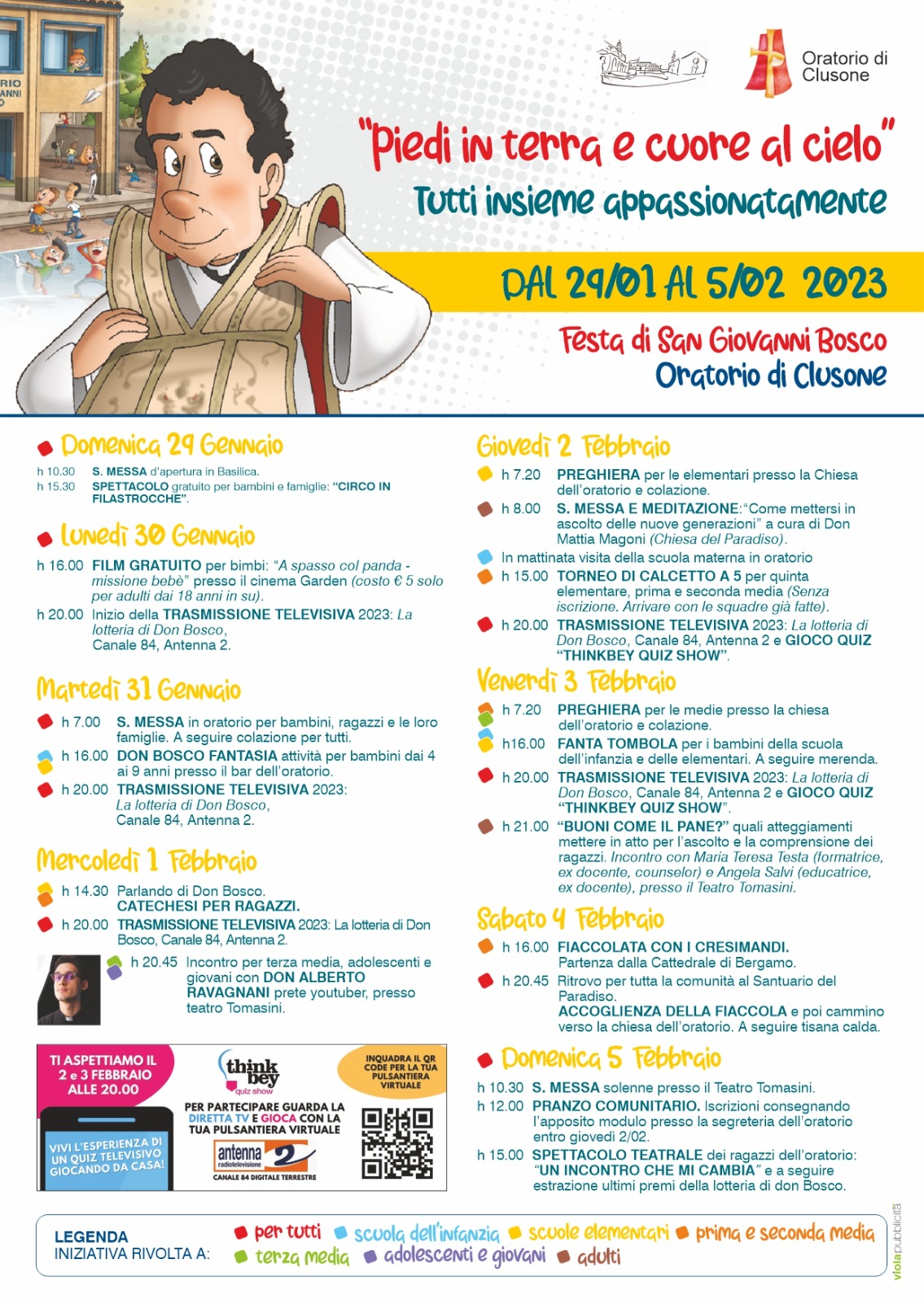 Tra i tanti appuntamenti la “lotteria di don Bosco”, da lunedì a venerdì su Antenna2 (canale 84 del digitale terrestre) dopo il telegiornale. «Ci sarà l’estrazione di biglietti della lotteria, che si possono ancora compare nei negozi di Clusone. Conosceremo una figura speciale della nostra comunità attraverso un fumetto. Giovedì e venerdì si potrà partecipare anche a un gioco da casa tramite una app da scaricare», aggiunge don Alex Carlessi.