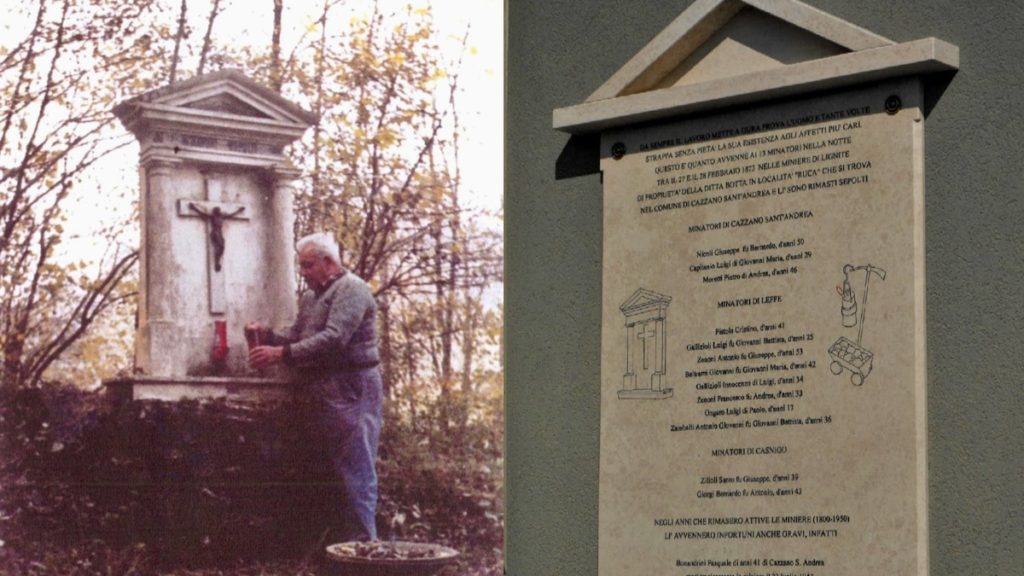 A ricordare il tragico episodio resta lungo una vecchia mulatteria (area di proprietà Zambaiti) una santella votiva eretta nel 1960 ad opera del cazzanese Adamo Colombi (nella foto in alto). Il lungo elenco dei deceduti comprende Giuseppe Nicoli, Luigi Capitanio e Pietro Moretti di Cazzano; Santo Zilioli e Bernardo Giorgi di Casnigo; Cristino Pistola, Luigi Gallizioli, Antonio Zenoni, Giovanni Beltrami, Innocenzo Gallizioli, Francesco Zenoni, Luigi Ongaro (appena 17 anni, il più giovane) e Antonio Zambaiti di Leffe. Quattro di loro avevano quattro figli ciascuno, Giuseppe Nicoli cinque e Bernardo Giorgi addirittura nove. Le miniere di lignite chiesero alla causa un triste tributo di lavoratori: il 23 luglio 1947 morì un ultimo operaio, il quarantunenne Pasquale Bonandrini di Cazzano Sant’Andrea.