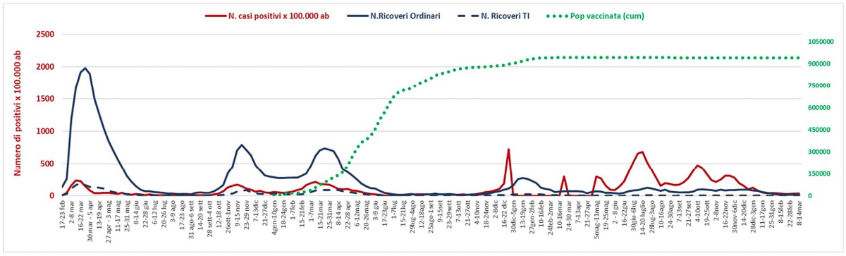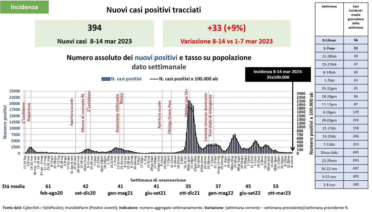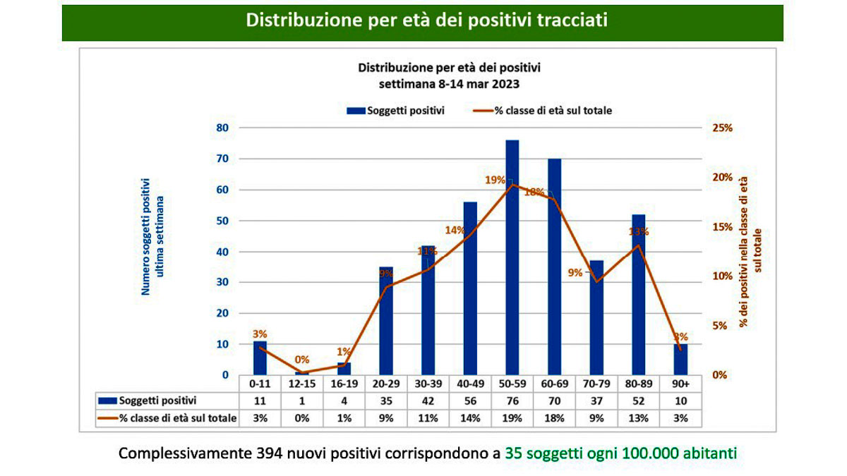 Nella seconda settimana di marzo (8-14 marzo 2023) si registrano 394 nuovi casi positivi, che corrispondono ad un tasso di incidenza pari a 35 nuovi casi per 100.000 abitanti. La differenza rispetto alla settimana precedente, che faceva registrare 31×100.000, non risulta statisticamente significativa. In termini assoluti si registrano +39 nuovi casi (+9%) rispetto alla settimana precedente. Negli ultimi 7 giorni la media giornaliera dei casi incidenti si mantiene pari a 56 nuovi casi, in linea con i 52 della scorsa settimana.