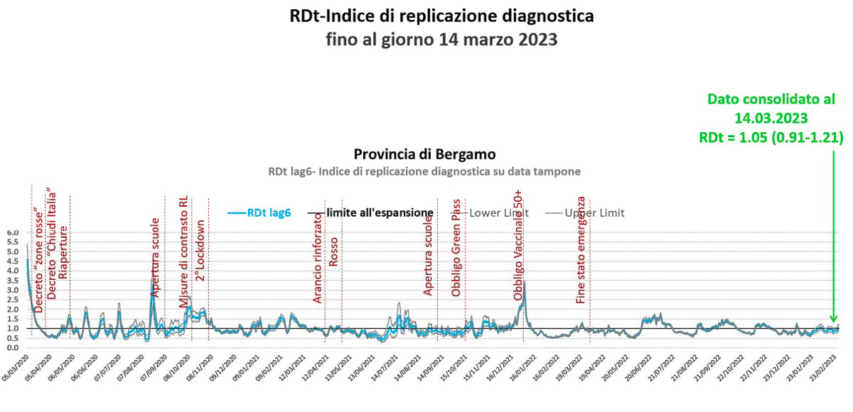 L’indice di replicazione diagnostica (RDt) continua a mostrare una sostanziale stabilità tra settimana corrente e precedente facendo registrare al 14 marzo 2023 il valore di 1.05 (0.91-1.21).