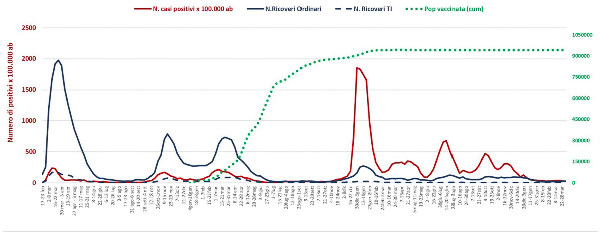 Nella settimana dal 29 marzo al 4 aprile 2023 si contano 314 nuovi casi positivi, a cui corrisponde un tasso di incidenza pari a 28 nuovi casi per 100.000 abitanti. Si registra una nuova flessione rispetto alla settimana precedente, nella quale si contavano 374 casi (-60 casi in termini assoluti, a cui corrisponde un calo percentuale del 16%) e un tasso di incidenza pari a 33 nuovi casi per 100.000 abitanti. Negli ultimi 7 giorni la media giornaliera dei casi incidenti scende da 53 a 45 nuovi casi.