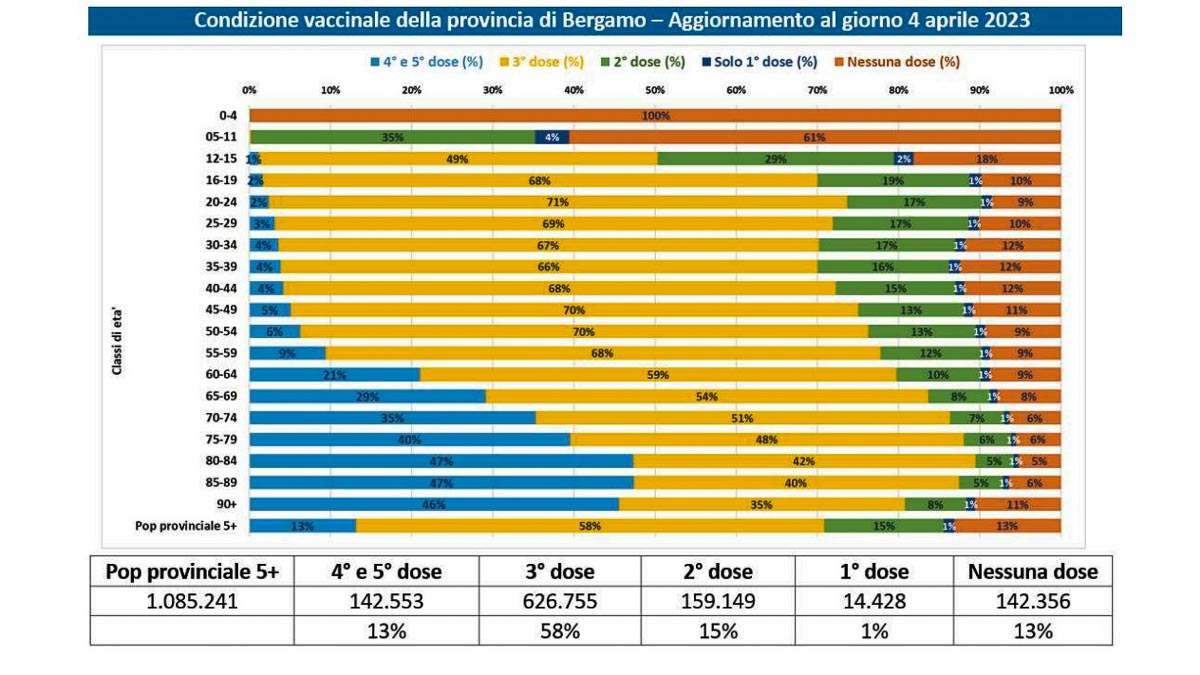 Nella settimana osservata lo stato vaccinale in provincia di Bergamo mostra coperture complete (terze/quarte/quinte dosi) per il 71% della popolazione superiore a 5 anni di età. La quarta e quinta dose, rispettivamente il 12,5% e lo 0,7% della popolazione eligibile, presentano complessivamente il 13% della copertura vaccinale con percentuali superiori al 45% solo per le fasce di età over 80. La quota di popolazione non vaccinata è stabile, ormai da mesi, intorno al 13%.