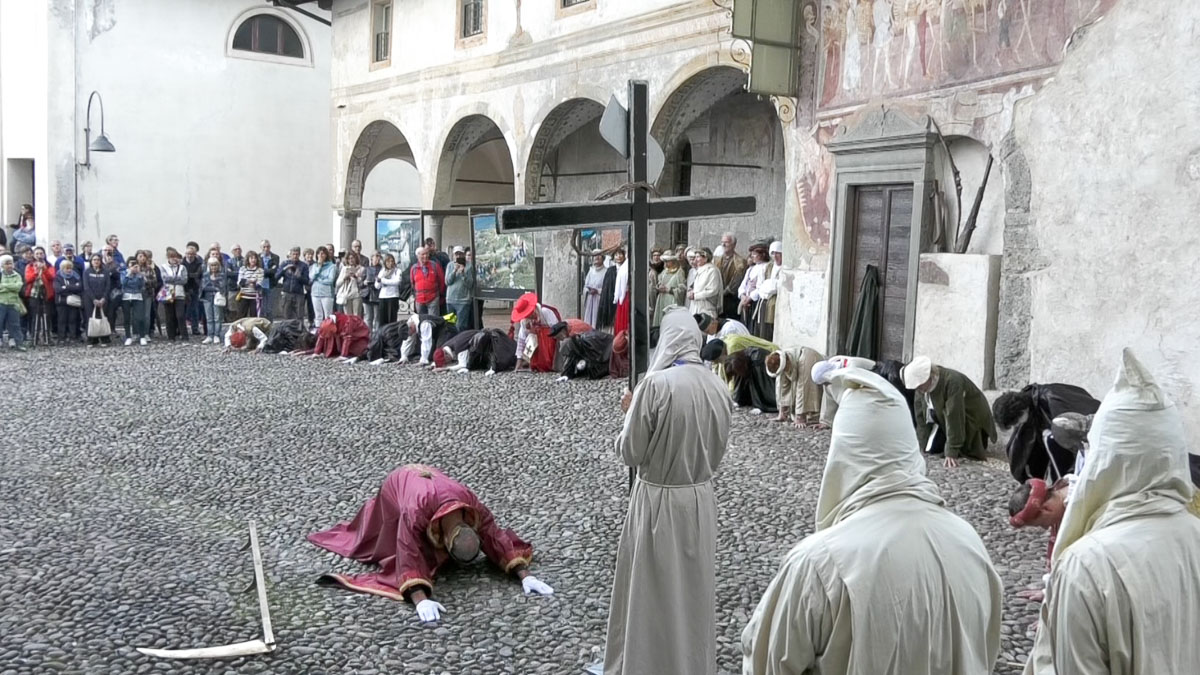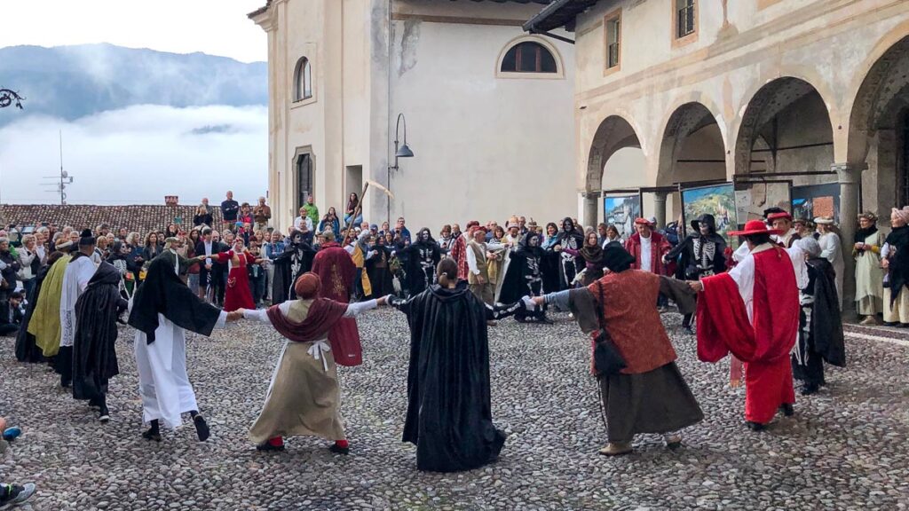 Proprio con questa chiave di lettura, sul sagrato della Basilica, si è chiusa la danza. Sotto agli affreschi del Borlone, ha fatto la sua comparsa la Morte che con la falce ha mietuto il raccolto per l’aldilà. Ma anche lei, la regina, ha dovuto inchinarsi alla croce portata dai Disciplini.