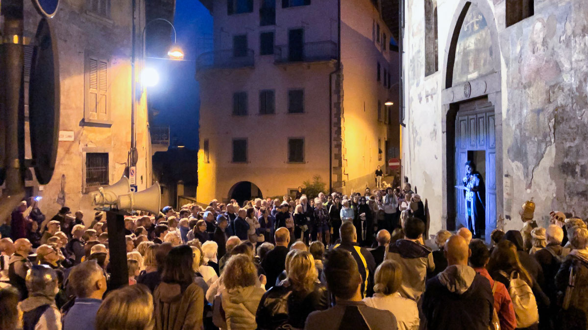 Hanno dato corpo e voce alla rappresentazione una cinquantina di attori e comparse, alcuni particolarmente efficaci per verve e spontaneità. A condurre e ricollegare il tutto ci ha pensato Matteo Benzoni, del Circolo culturale Baradello. «La rappresentazione del nostro destino in questa forma fa riflettere il vivo – ha spiegato -, che guardando lo scheletro, si interroga sulla sua sorte: la danza è un modo per sdrammatizzare ed esorcizzare la paura di questo incontro, il mezzo espressivo del senso della morte. Ma è davvero la fine di tutto? I Disciplini, 538 anni fa, ci hanno lasciato una preziosa chiave di lettura».