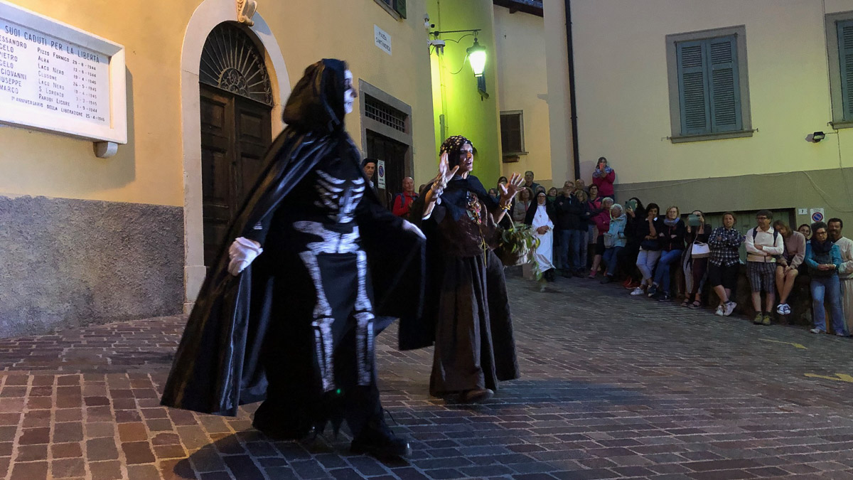 I temi del Trionfo della morte e della Danza macabra hanno preso ancor più suggestione nell’incontro fra tenebre e luce, quando il giorno si confonde nella notte, e il fantastico sembra acquisire consistenza di realtà. La rappresentazione si è giocata tutta sul confronto tra gli scheletri e i vivi, come era avvenuto il 21 aprile, quando era stata proposta per la prima volta, seppur in versione ridotta. Da piazza della Rocca al sagrato della Basilica si sono snodate nove scene, passando per piazza Paradiso, il parco Nastro Azzurro, piazza e corte Sant’Anna, piazza Sant’Andrea, piazza dell’Orologio. Costante il canovaccio: gli scheletri che venivano a prendere i vivi e i vivi che non volevano andarsene, in una danza tra aldiquà e aldilà. Appunto, la “Scricchiolante Sarabanda” del titolo.