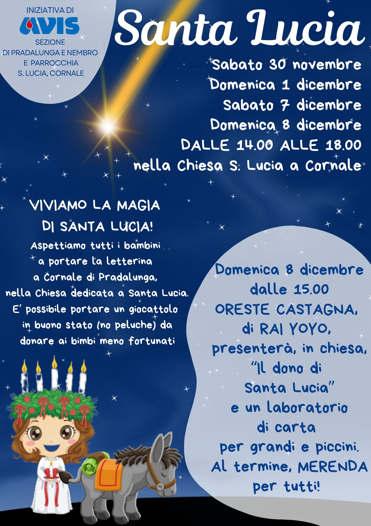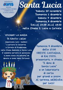 I gruppi Avis dei due paesi accoglieranno i bambini, racconteranno loro la storia della Santa, regalando il kit dell’accoglienza per Santa Lucia e l’asinello, offrendo tè e biscotti e gadget Avis. La cara Santa penserà anche ai bambini meno fortunati e quanti passeranno dalla Chiesa di Cornale potranno lasciare ai piedi della statua un gioco da regalare ai bimbi meno fortunati. In settimana saranno accolte anche le scuole materne del territorio.