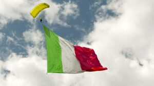 Gandellino. Festa dei paracadutisti della Val Seriana: dall’elicottero di Simone Moro lancio con bandiera italiana da 600 metri quadrati.