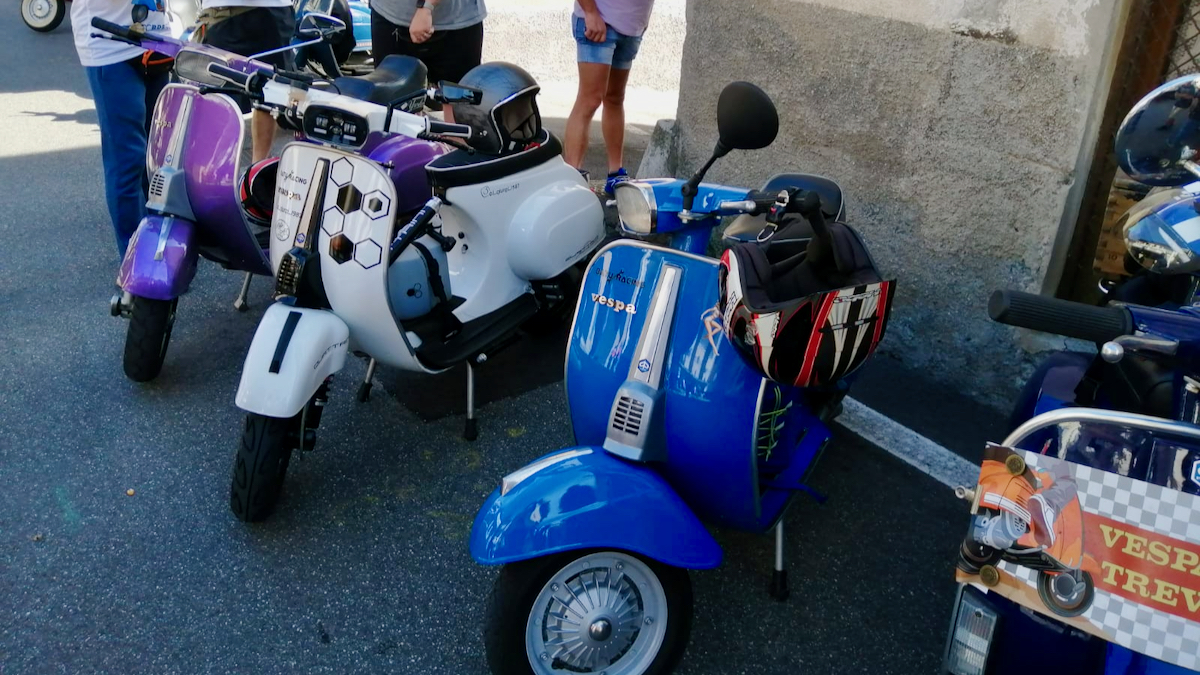 Alla partenza a prendersi gli obiettivi dei fotografi sono stati innanzitutto alcuni bimbi con piccole Vespa giocattolo a spinta. Hanno presto lasciato la scena ai Maggiolini d’epoca e soprattutto allo sciame motorizzato di iscritti. Dopo aver percorso i centri abitati della Val Gandino, i mezzi si sono radunati a Peia, sul sagrato della parrocchiale, per la benedizione impartita dal parroco don Alberto Gervasoni, amico vespista.
