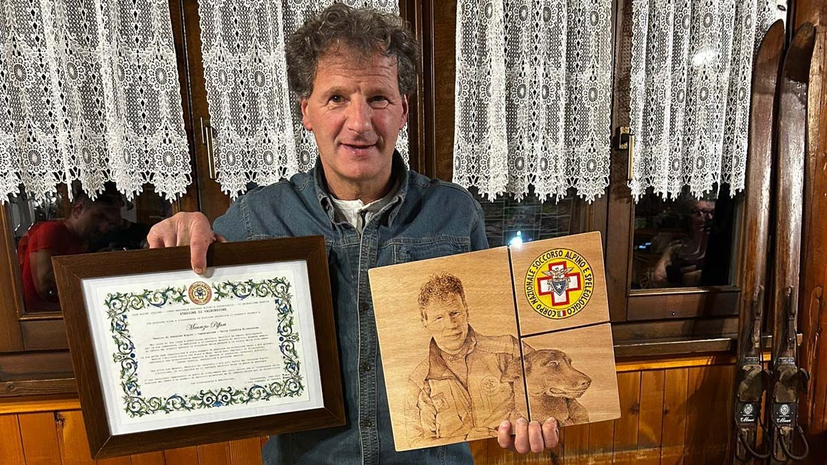 Durante la serata, i volontari della Stazione hanno consegnato a Piffari una pergamena di encomio che richiama la sua lunga attività e ne sottolinea la competenza, dedizione e costante attenzione alla sicurezza, la funzione di guida per i più giovani e l’esperienza maturata in condizioni invernali impegnative. I cinofili hanno invece consegnato un quadretto pirografato.