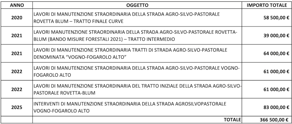 «Quest’ultimo progetto ci ha fornito l’occasione per fare una valutazione degli investimenti destinati alle due strade agro-silvo-pastorali del Monte Blum e del Monte Fogarolo – aggiunge Marinoni -. Sono ben sei interventi degli ultimi cinque anni, compreso quello di recente finanziato dalla Regione, per un investimento complessivo di 360 mila euro: circa 200 mila euro su Fogarolo e 160 mila sul Monte Blum».